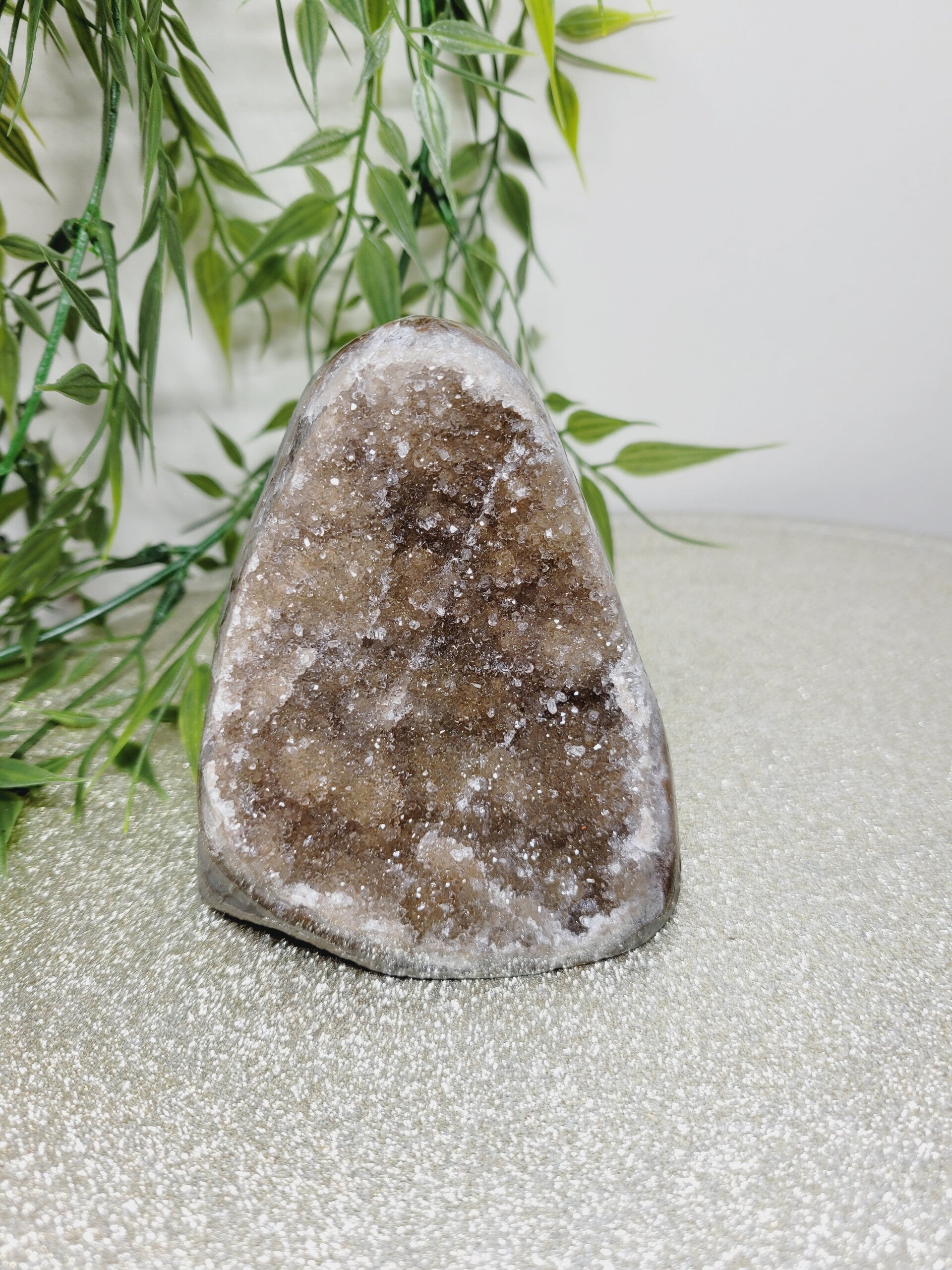 Deze regenboog Amethisten met kleine, fijne kristalletjes schitteren je tegemoet.