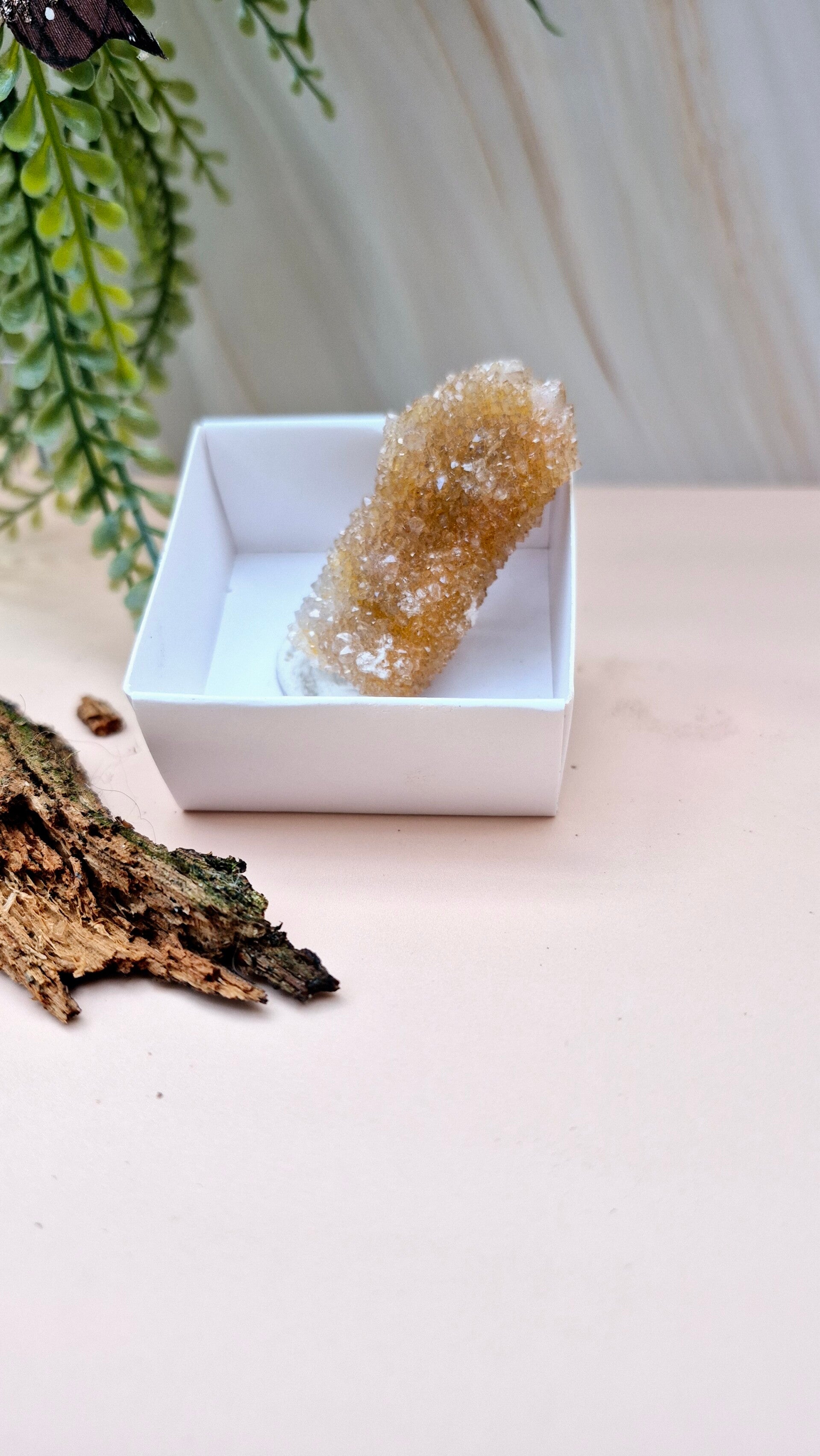 De gouden kleur van Gouden Spiritkwarts wordt veroorzaakt door insluitsels van ijzeroxide, een natuurlijk proces tijdens de vorming van de steen.