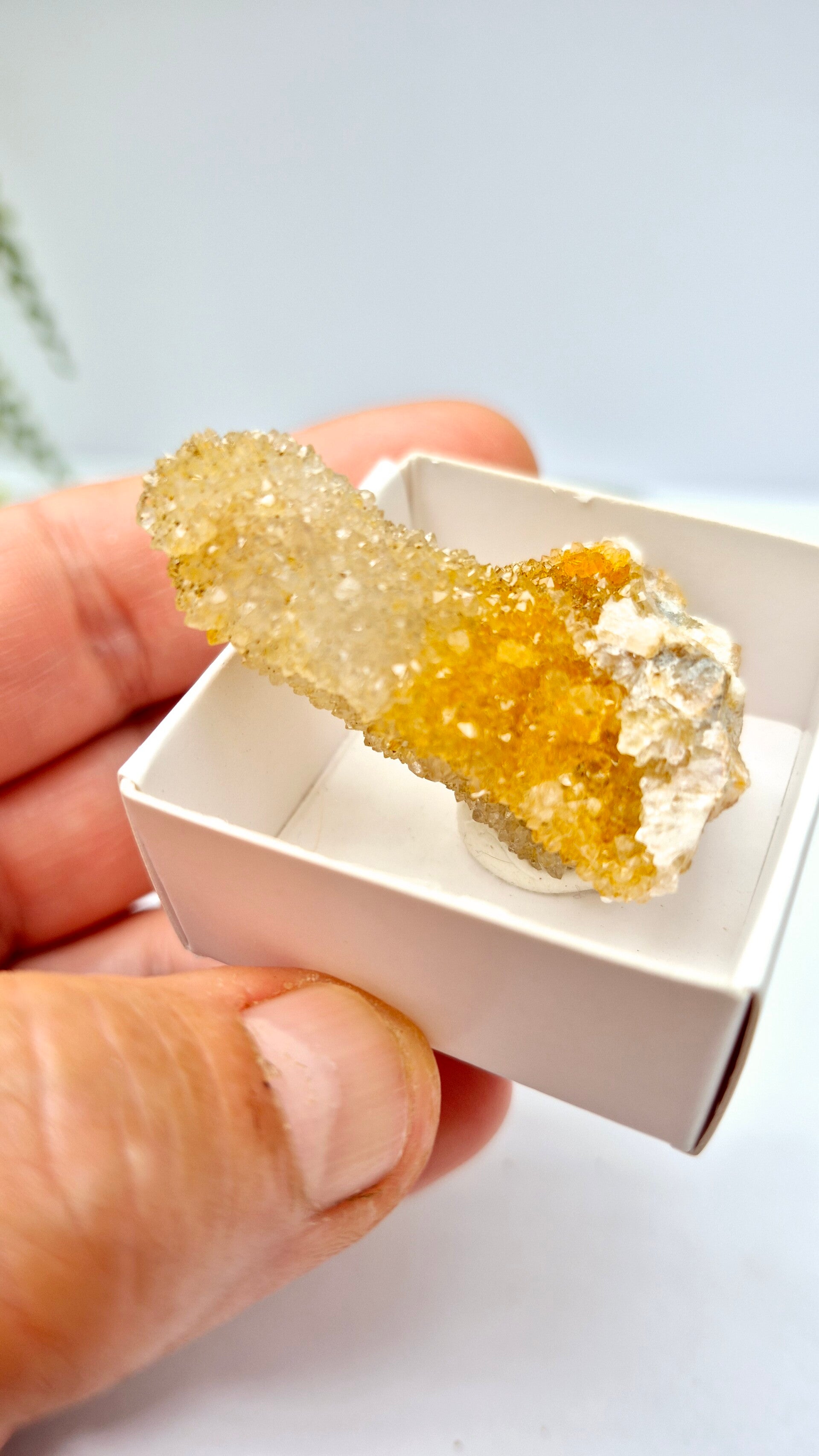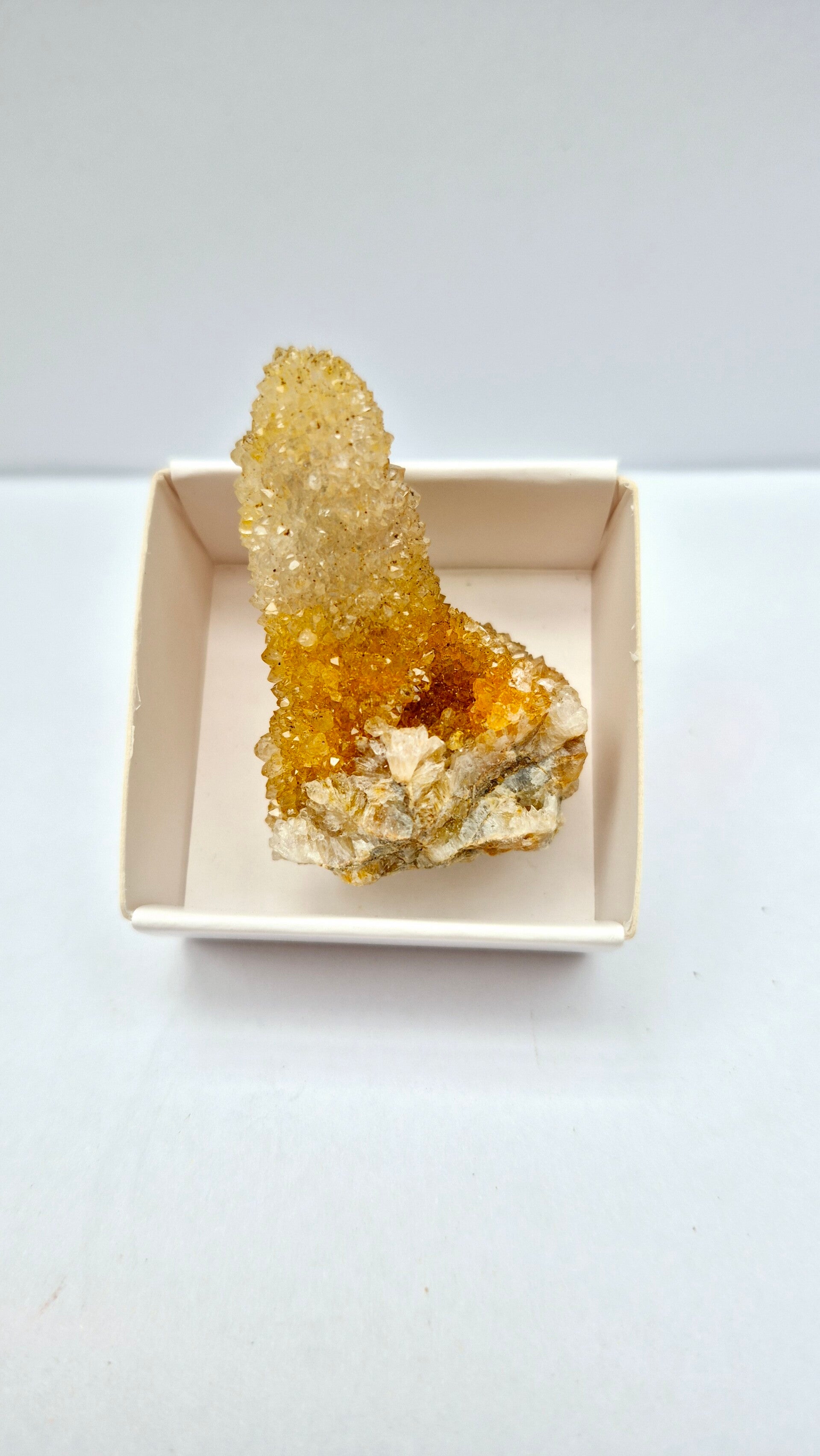 De gouden kleur van Gouden Spiritkwarts wordt veroorzaakt door insluitsels van ijzeroxide, een natuurlijk proces tijdens de vorming van de steen.