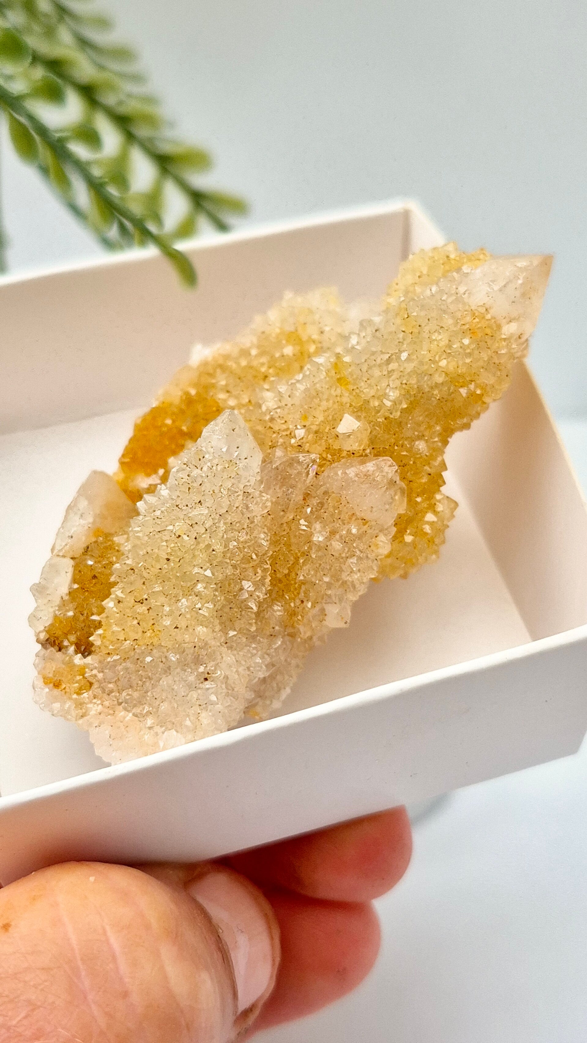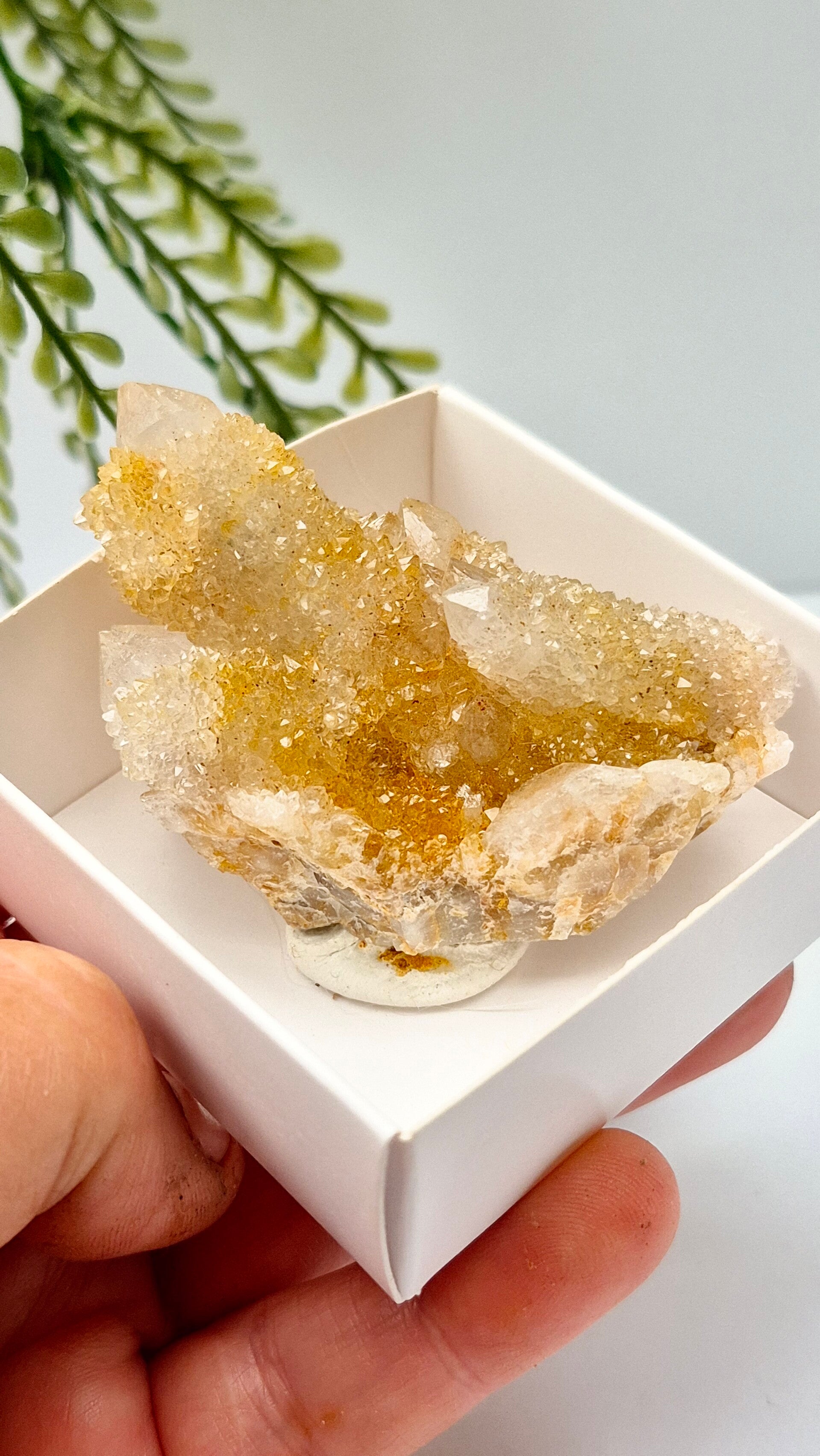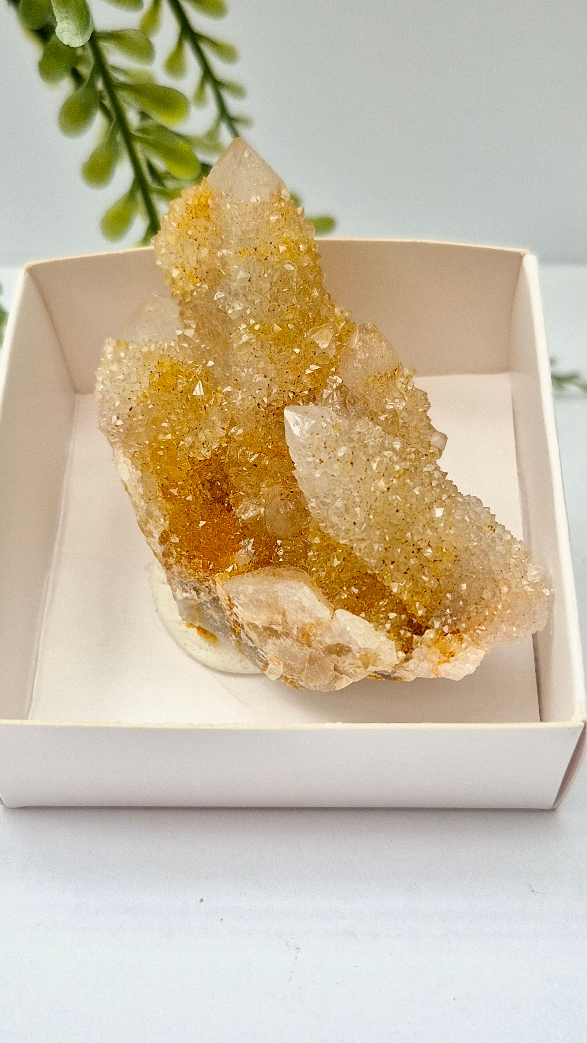 De gouden kleur van Gouden Spiritkwarts wordt veroorzaakt door insluitsels van ijzeroxide, een natuurlijk proces tijdens de vorming van de steen.