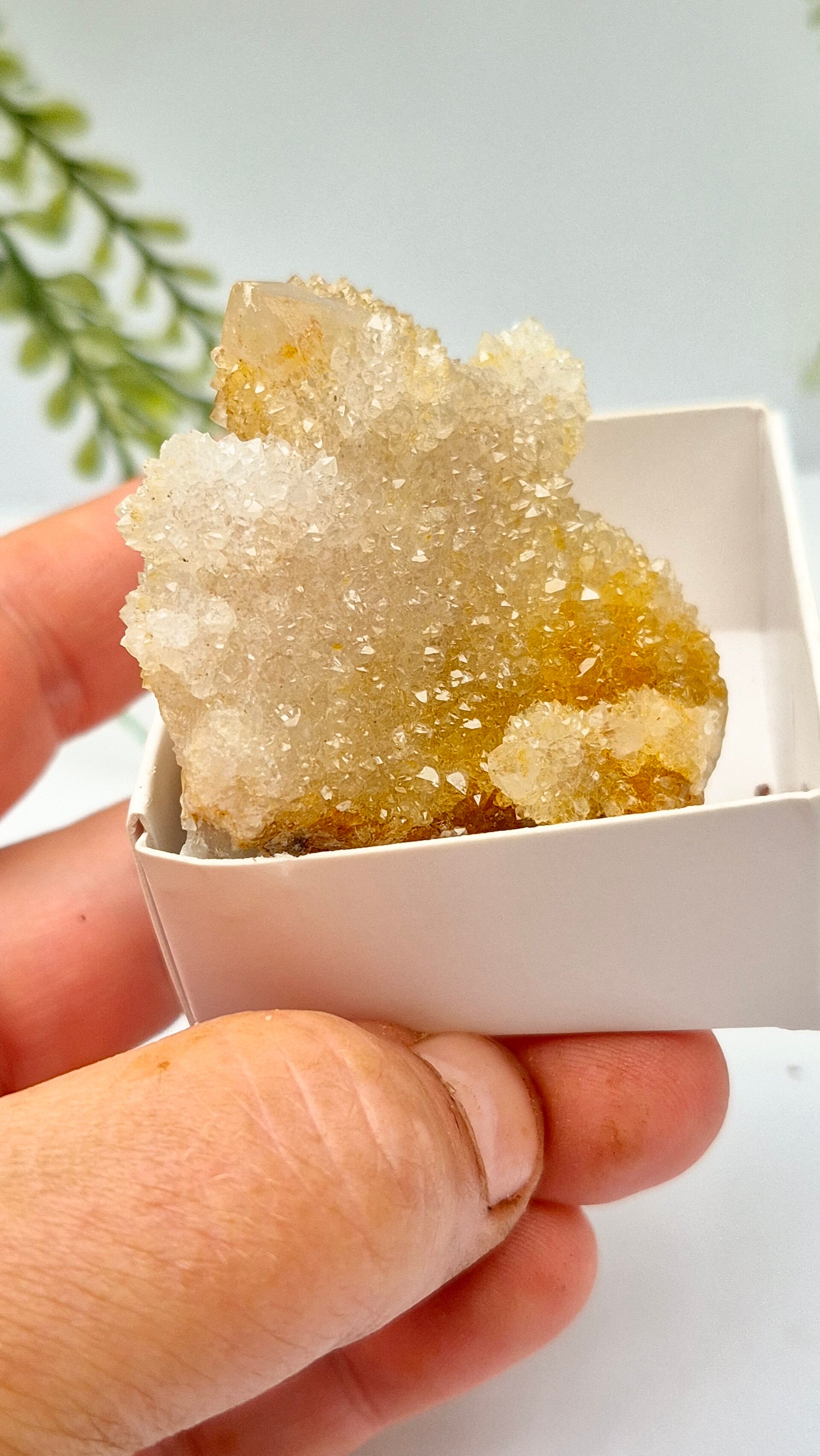 De gouden kleur van Gouden Spiritkwarts wordt veroorzaakt door insluitsels van ijzeroxide, een natuurlijk proces tijdens de vorming van de steen.