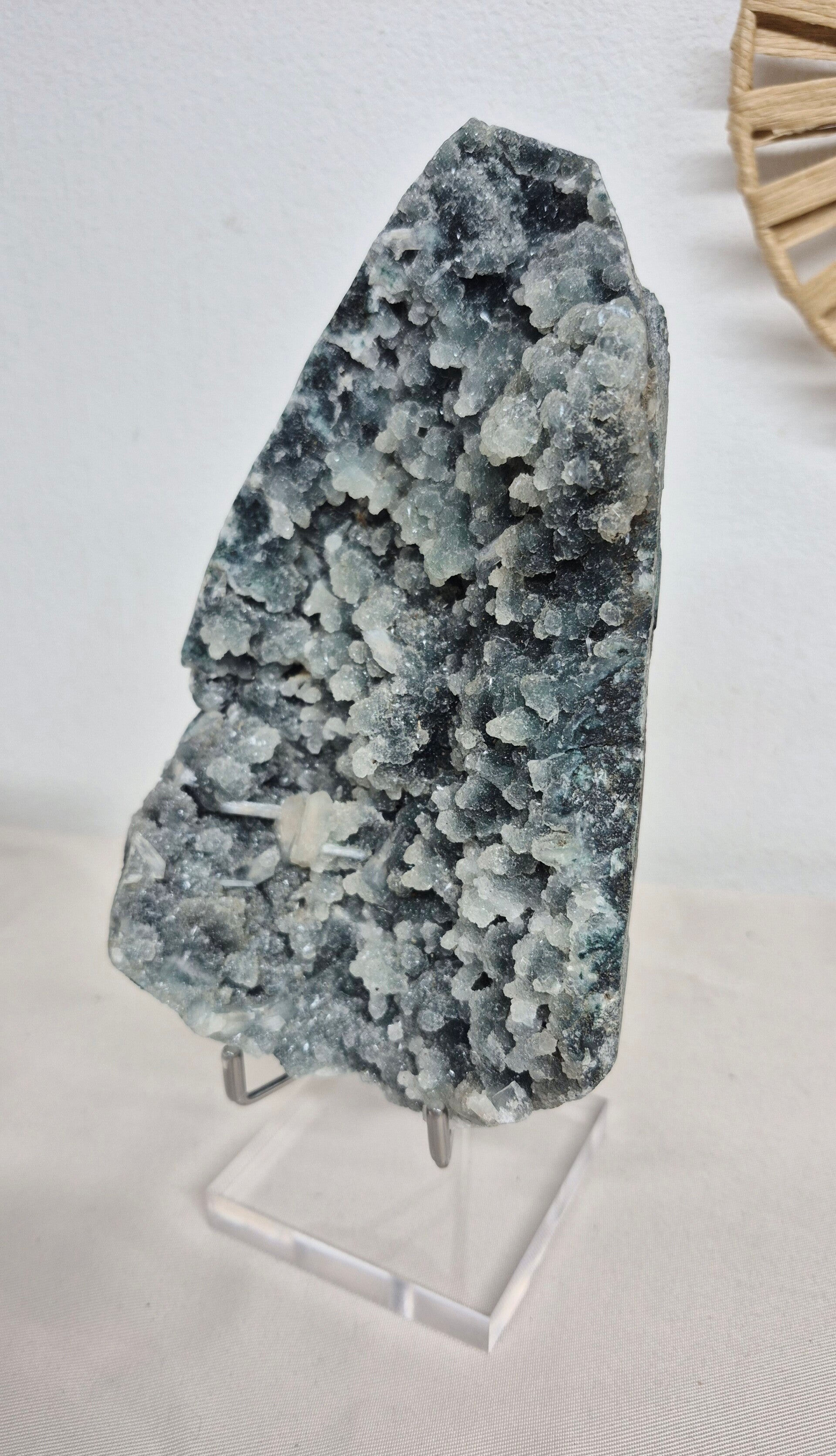 Apofyliet op chalcedoon is een combinatie van mineralen die vooral bekend staat om zijn kalmerende en spirituele eigenschappen, met name voor meditatie en communicatie.
