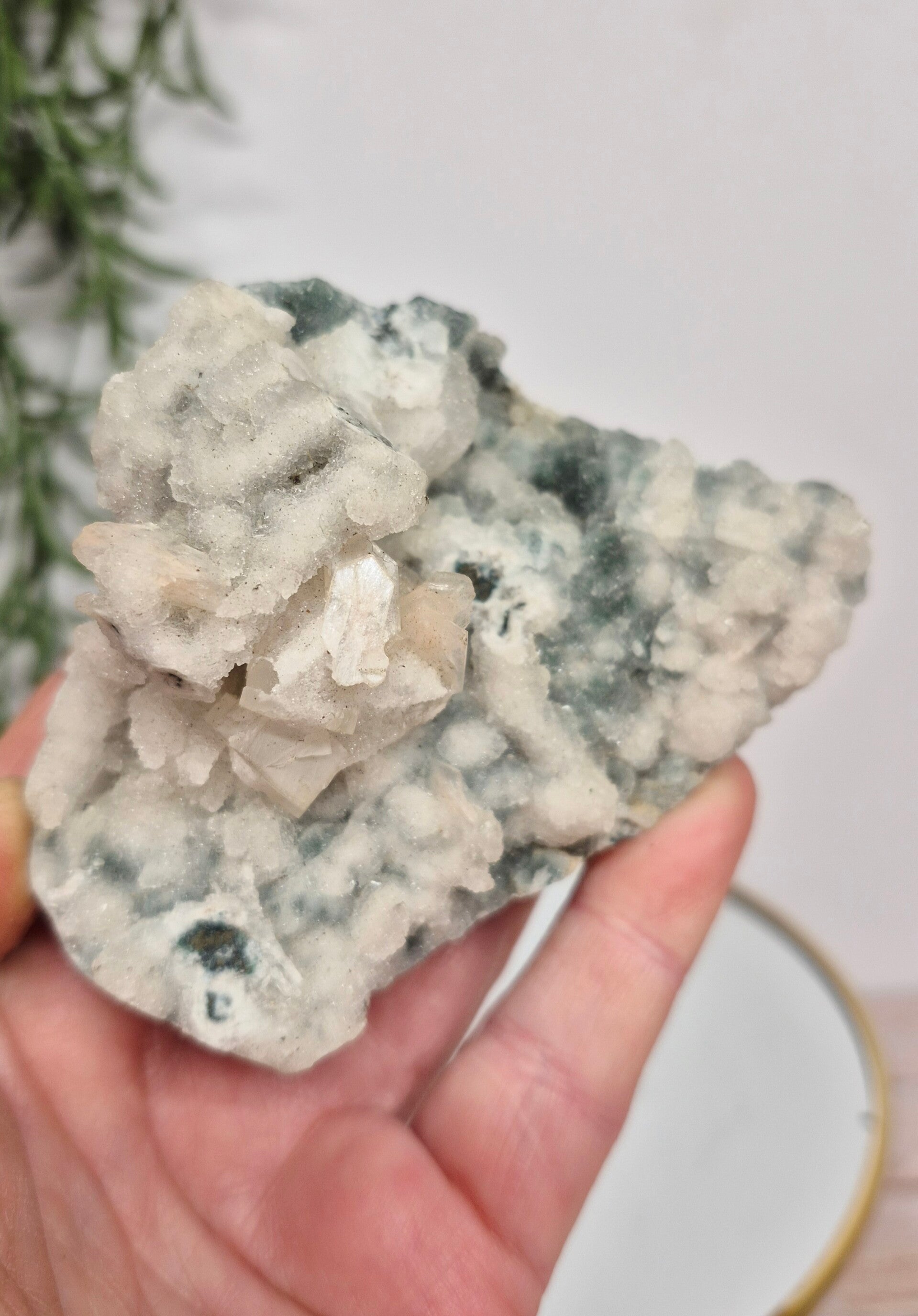 Apofyliet op chalcedoon is een combinatie van mineralen die vooral bekend staat om zijn kalmerende en spirituele eigenschappen, met name voor meditatie en communicatie.