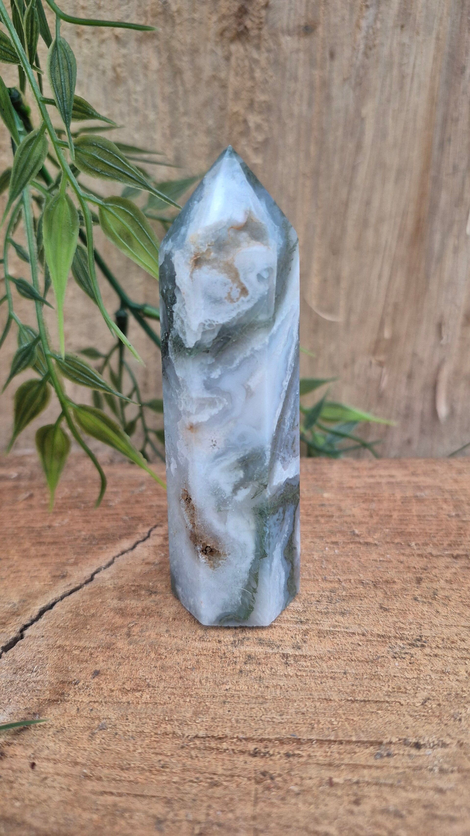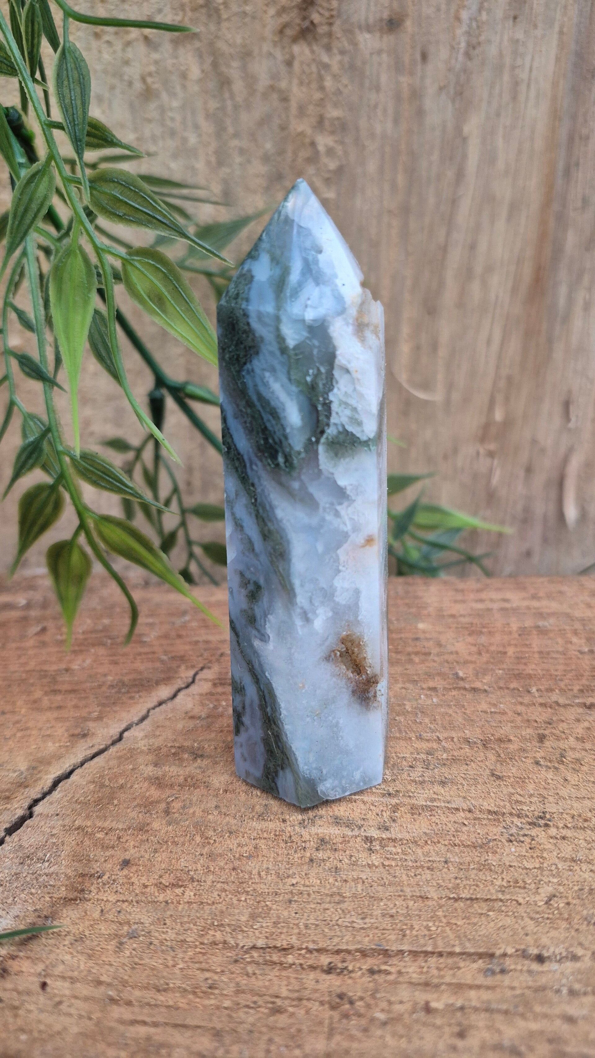 Mosagaat heeft een fijne aardende werking en heeft een fijne zachte energie. Deze steen zet je fijn in het hier en nu en zorgt voor stabiliteit en balans tussen lichaam en geest.