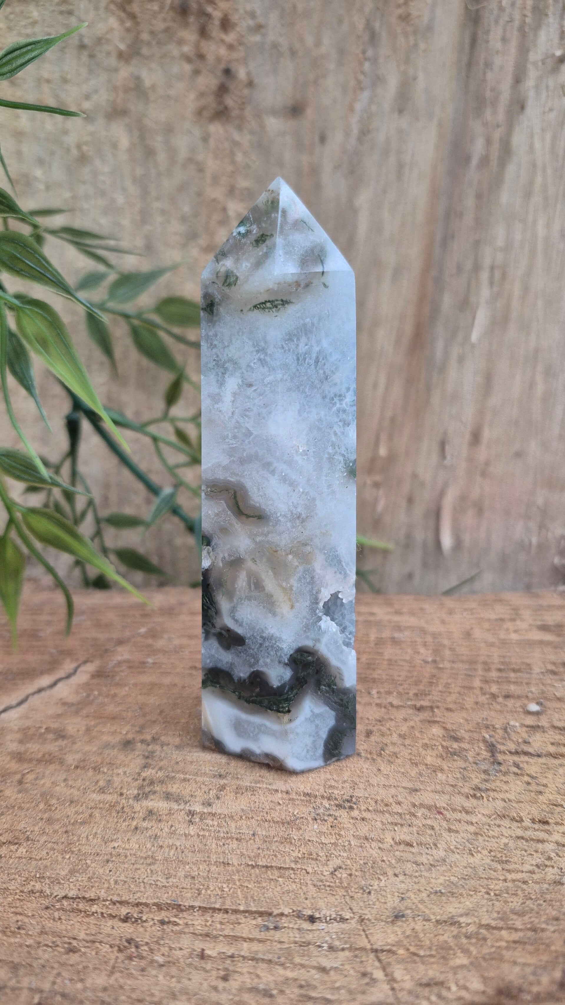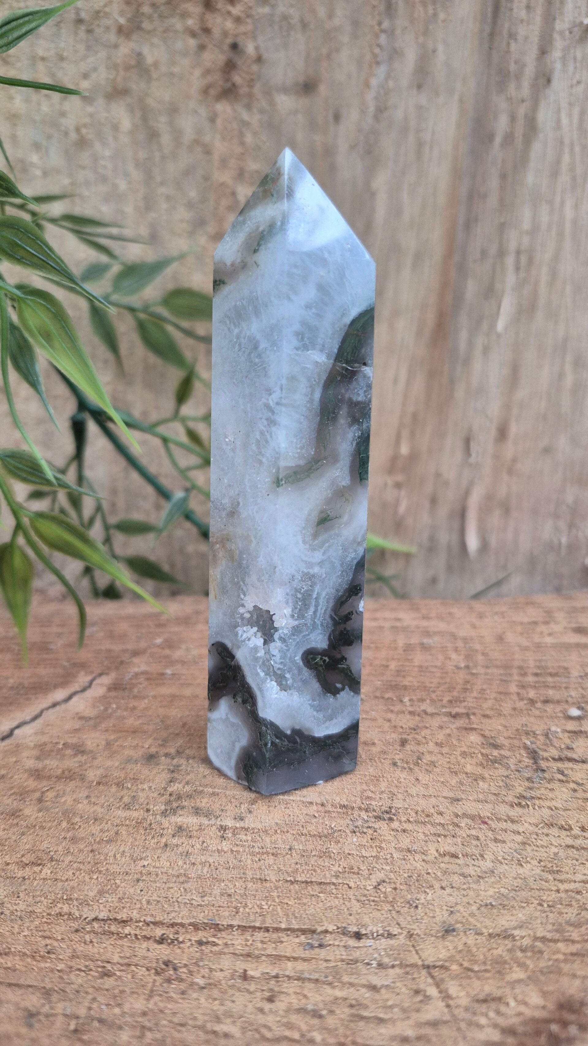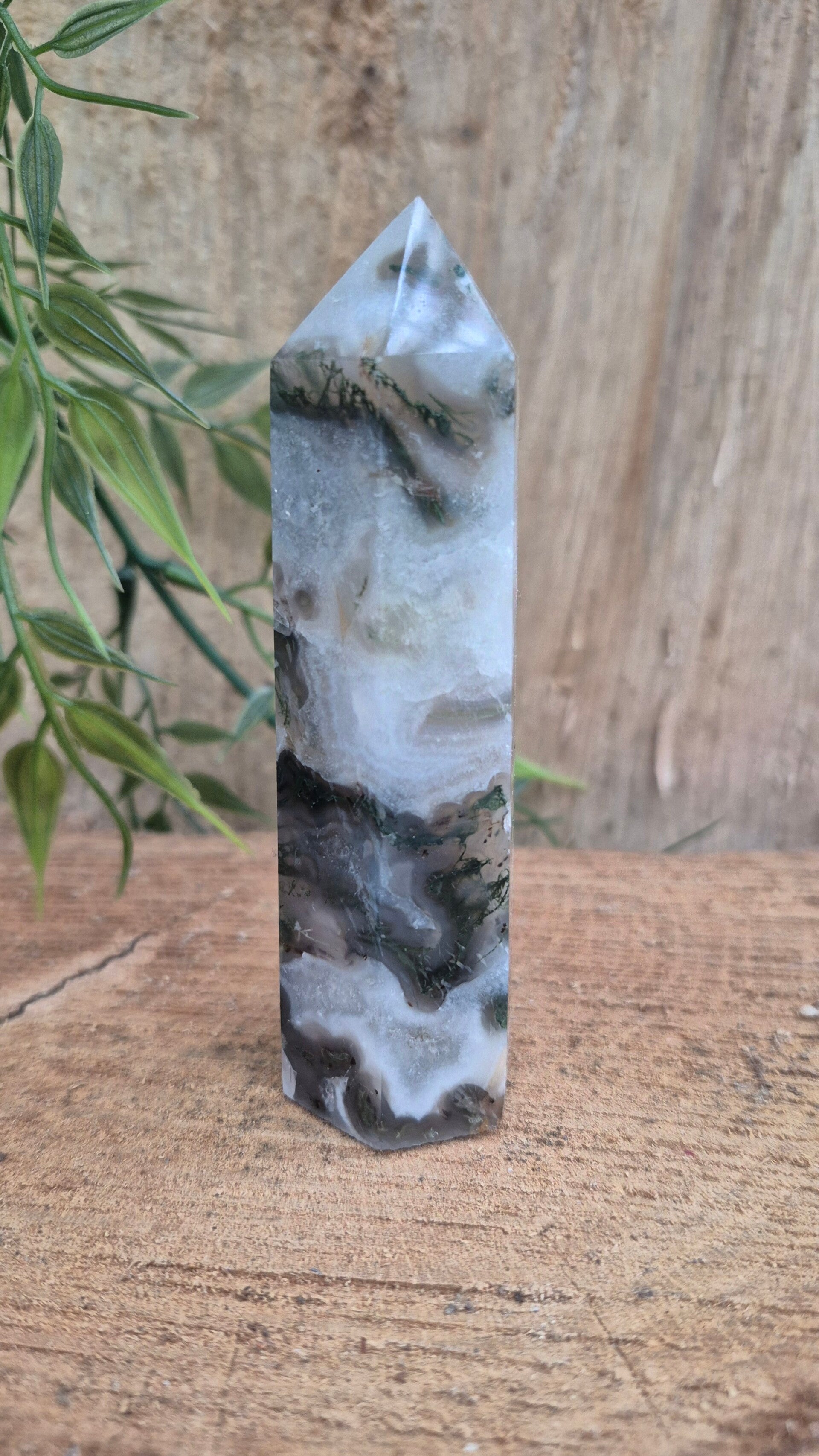 Mosagaat heeft een fijne aardende werking en heeft een fijne zachte energie. Deze steen zet je fijn in het hier en nu en zorgt voor stabiliteit en balans tussen lichaam en geest.