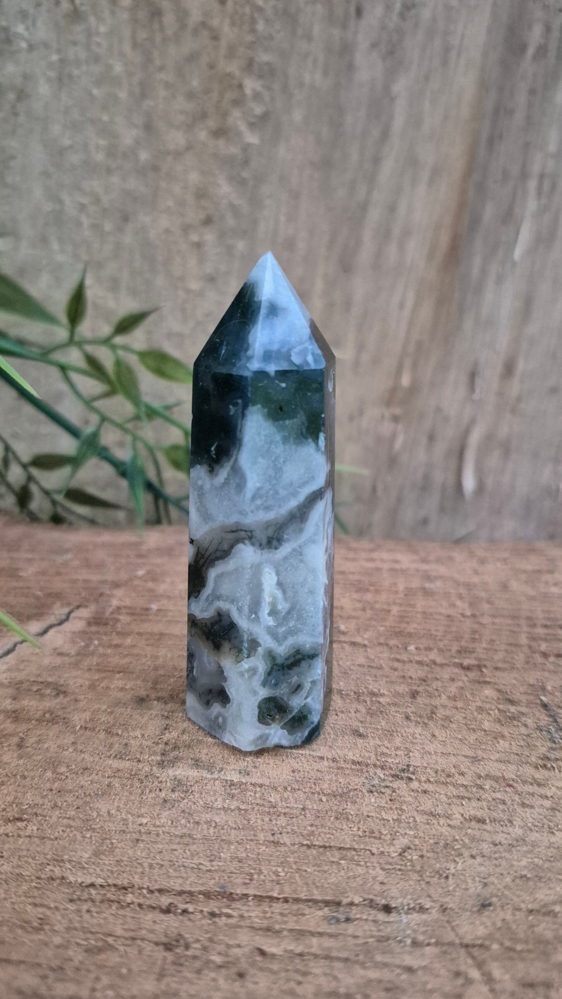 Mosagaat heeft een fijne aardende werking en heeft een fijne zachte energie. Deze steen zet je fijn in het hier en nu en zorgt voor stabiliteit en balans tussen lichaam en geest.